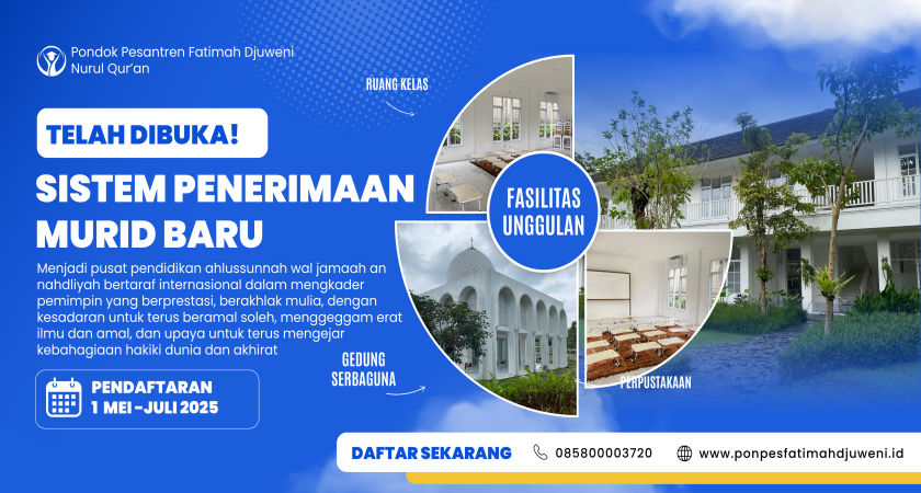 Ingin anak Anda hafal Qur'an, berakhlak mulia, dan unggul dalam pendidikan? Pesantren Fatimah Djuweni Nurul Qur’an adalah tempat terbaik untuk membentuk generasi tangguh, berilmu, dan beriman.
